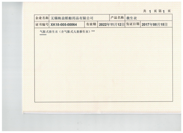 無錫海益船舶用品有限公司是船舶救生設備的專業生產企業,地處江蘇省無錫市,屬長江金三角腹地。主要生產氣脹式救生衣,三片式救生衣等各種救生設備,示位燈、信號設備、救生艇筏屬具及其它船舶配件。公司產品已越來越受世界各國用戶的青睞。